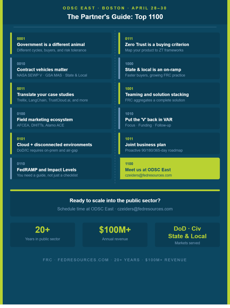 We’ve spent over 20 years in the public sector technology market. We’ve crossed the $100M annual revenue mark. And we’ve helped companies just like the ones at ODSC East — innovative, fast-moving, and built for commercial success — find their footing and scale in government. We’ll be at the booth during ODSC East, and we’d love to meet you. But first, here are the 1100 things we think every company at this conference should be thinking about.