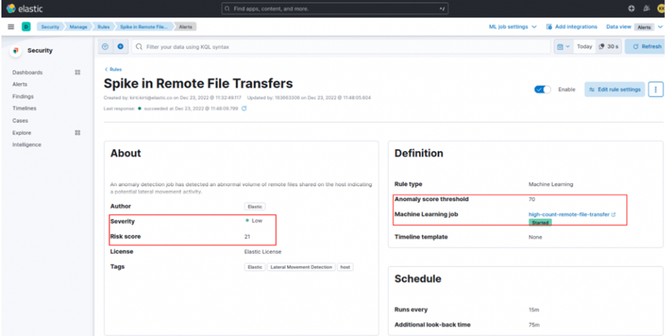 1. It Provides Context-Rich Alerts: Elastic ML provides a statistical “anomaly score” that highlights how unusual a specific behavior is. This immediately separates a critical deviation from benign statistical noise, drastically reducing alert fatigue.